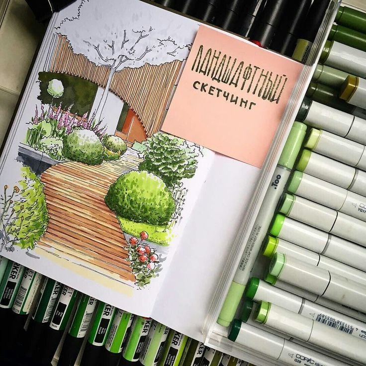 ![Ландшафтный скетчинг маркерами]()