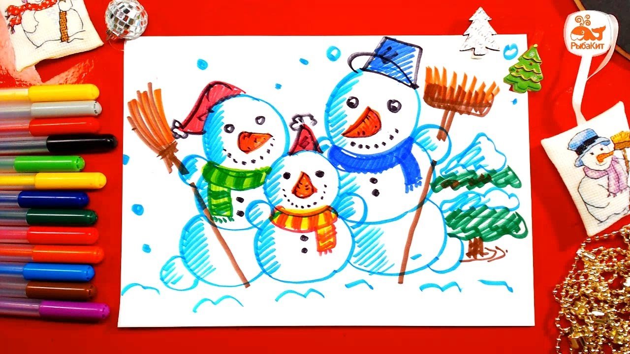 ![Снеговик цветными карандашами]()