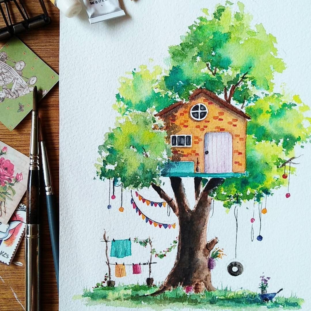 ![Домик на дереве акварель]()