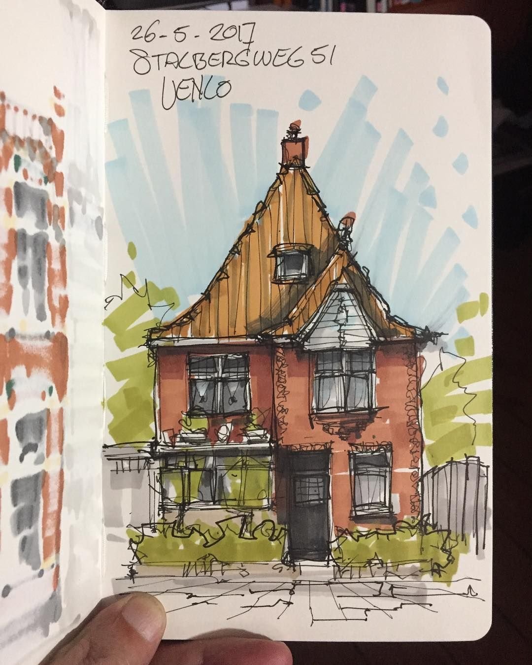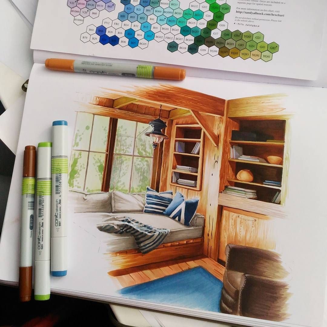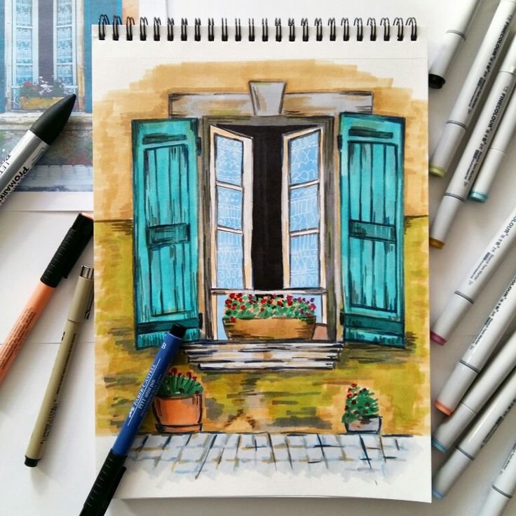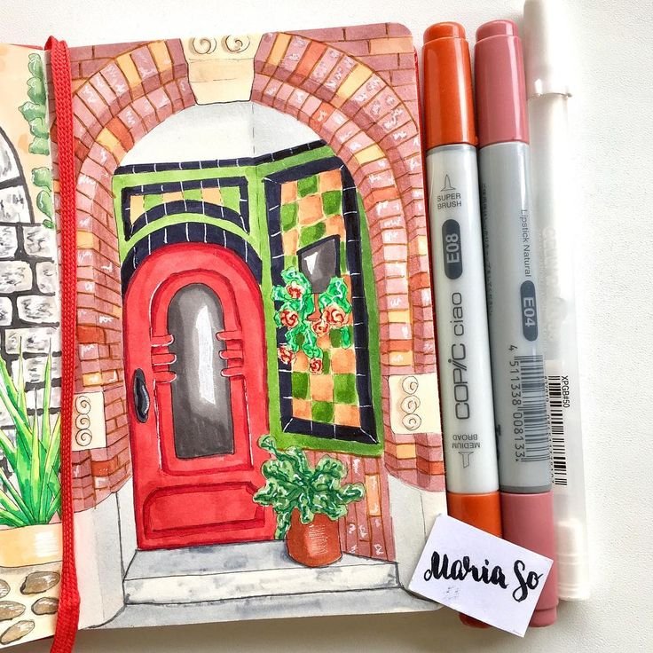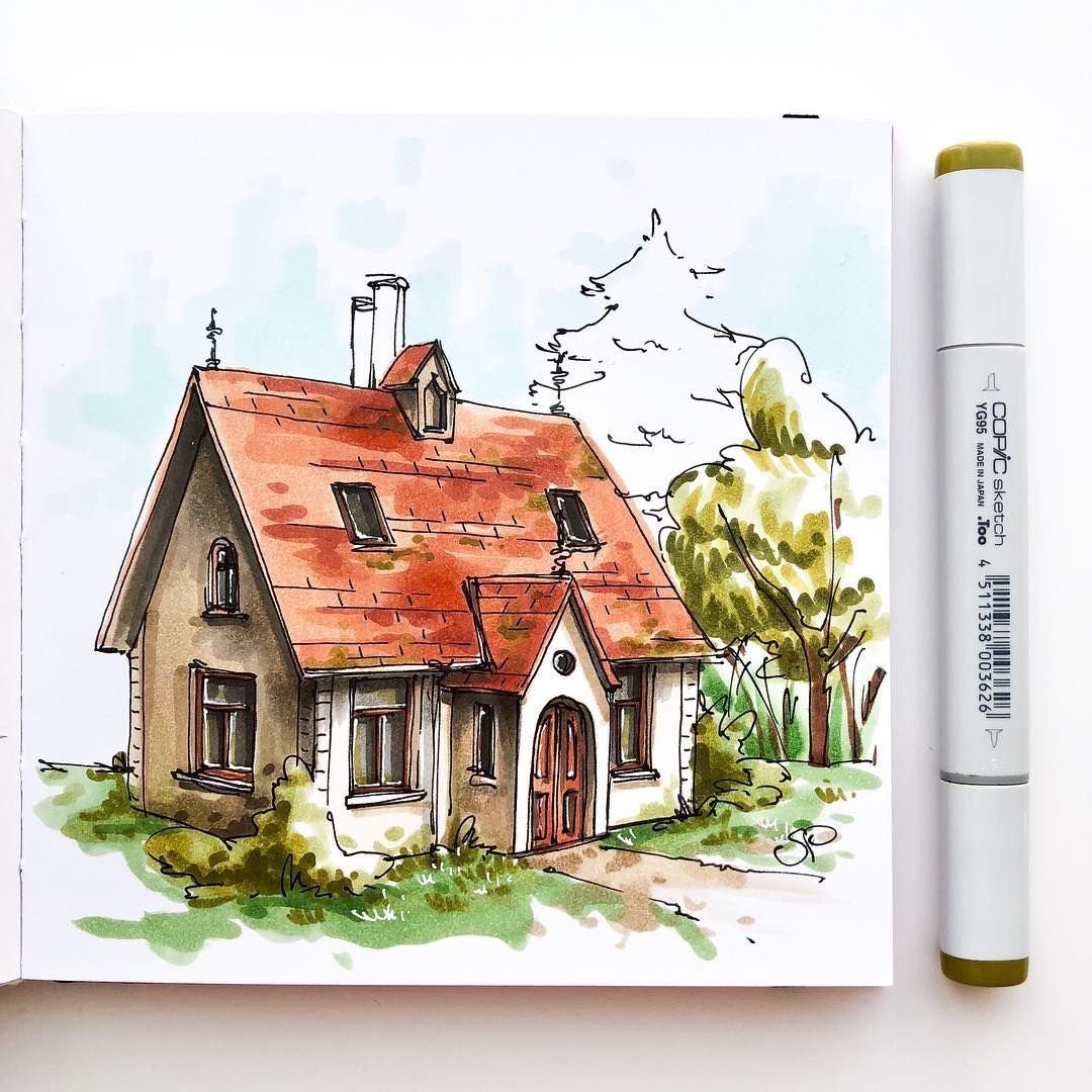 Рисунок домика маркерами скетчбук