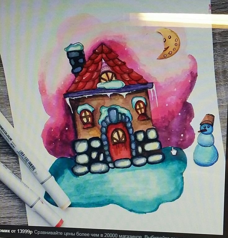 ![Рисунок домика маркерами скетчбук]()