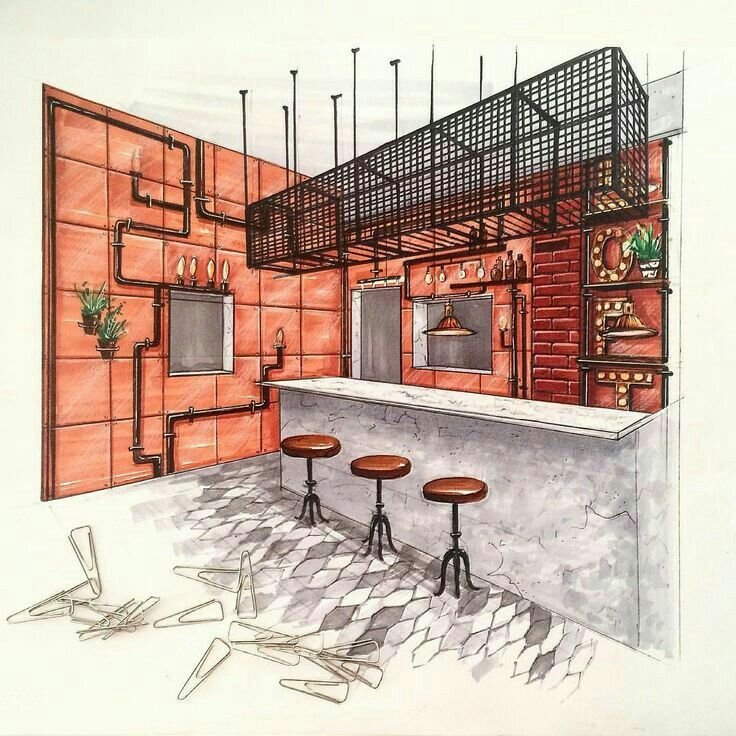 ![Скетч интерьера кафе]()