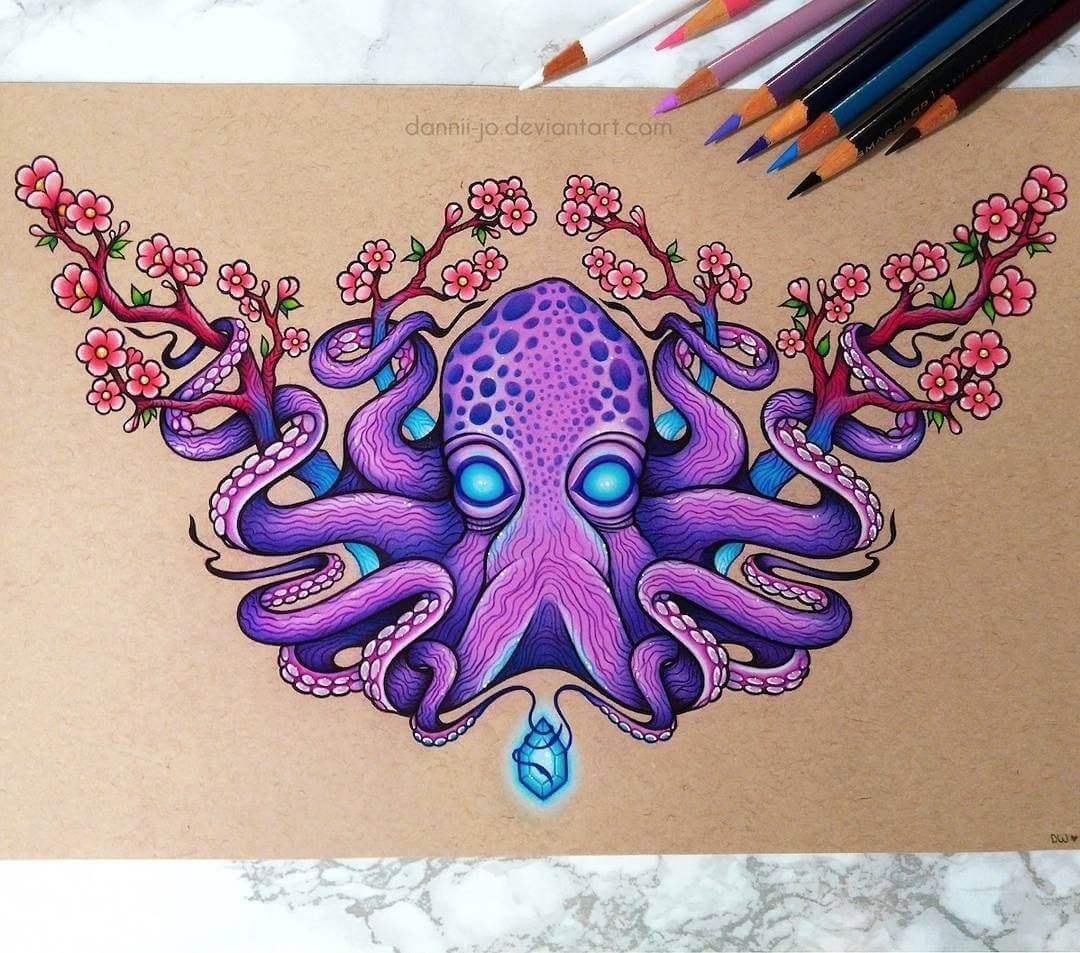 Великолепный рисунок осьминога, выполненный с использованием маркеров, поразит вас своим ярким и насыщенным цветом. Каждая деталь тщательно проработана, создавая ощущение реалистичности и глубины. Осьминог изображен в полной своей красе, его щупальца изящно переплетаются и распространяются в разные стороны, создавая эффект движения. Этот уникальный рисунок станет прекрасным украшением для вашего интерьера или отличным подарком для любителей морских существ и искусства.
