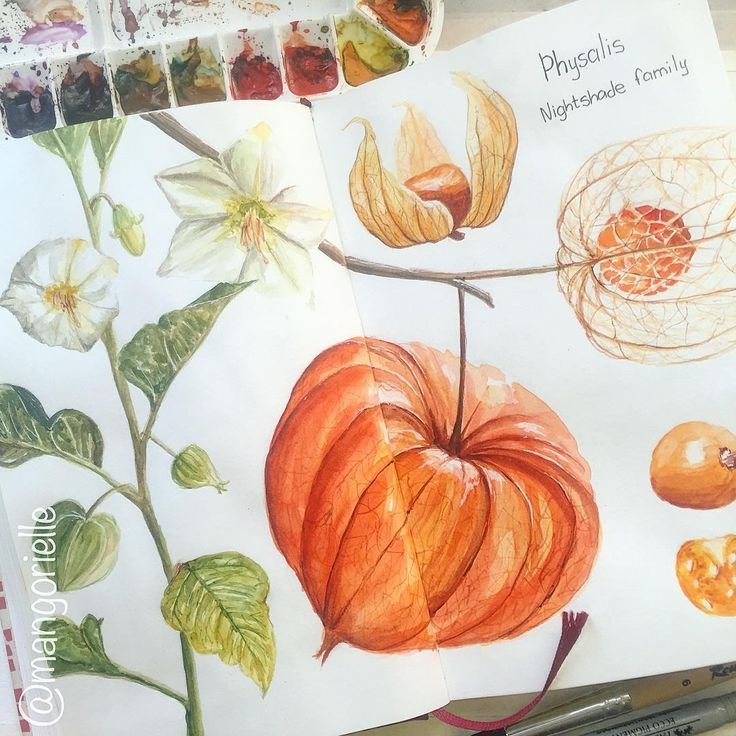 ![Ботаническая живопись акварелью физалис]()