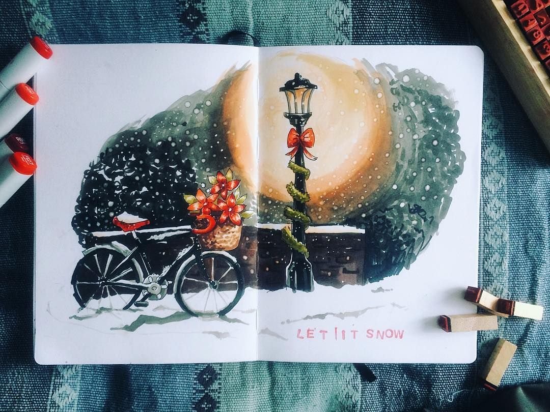 ![Зимние скетчи маркерами]()