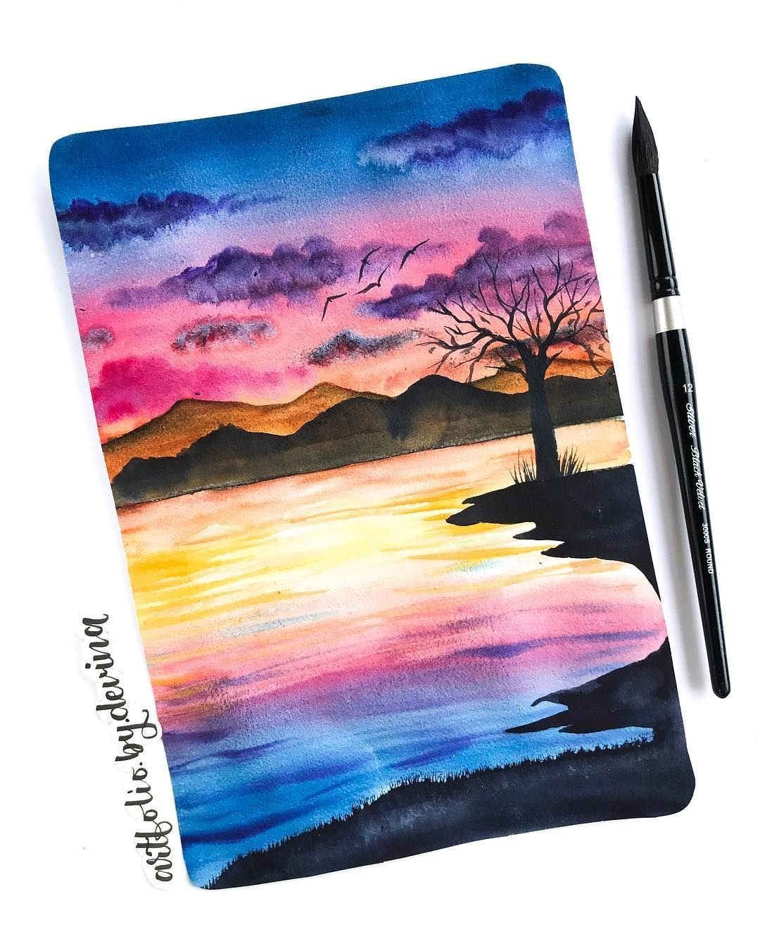Пейзаж акварелью закат