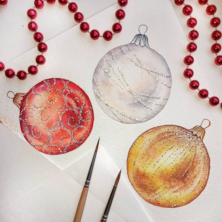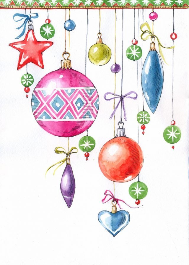Открытка елочные игрушки акварелью
