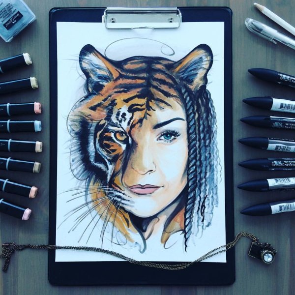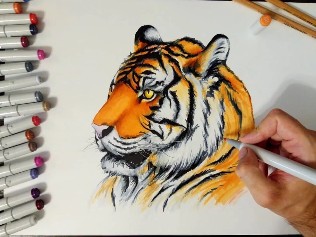 ![Тигр маркерами для скетчинга]()