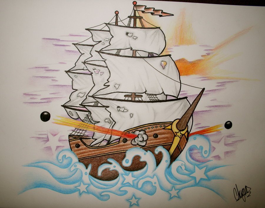![Пиратский корабль карандашом цветным]()