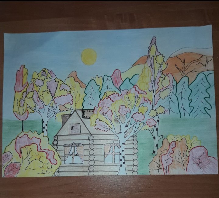 ![Пейзаж осени цветными карандашами]()