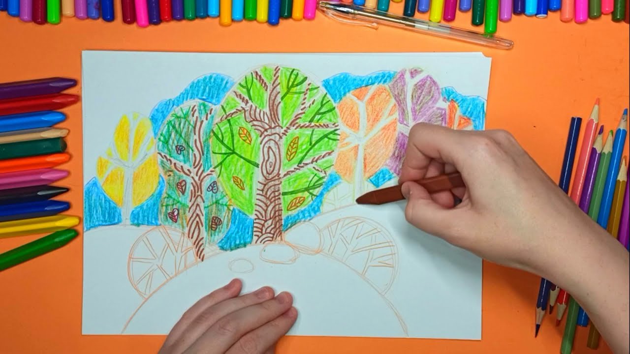 ![Осень цветными карандашами для детей]()