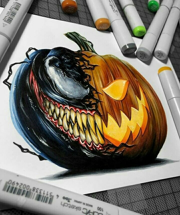 ![Хэллоуинская тыква рисунок маркером для скетчинга]()