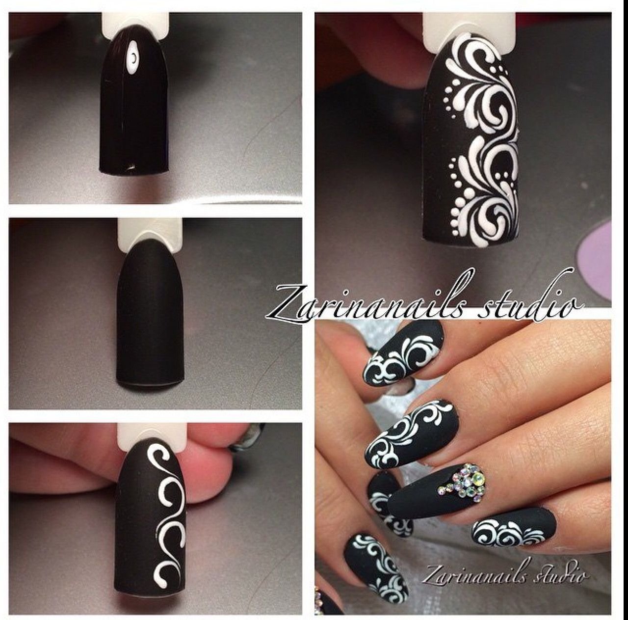 ![Красивый маникюр с черными вензелями]()