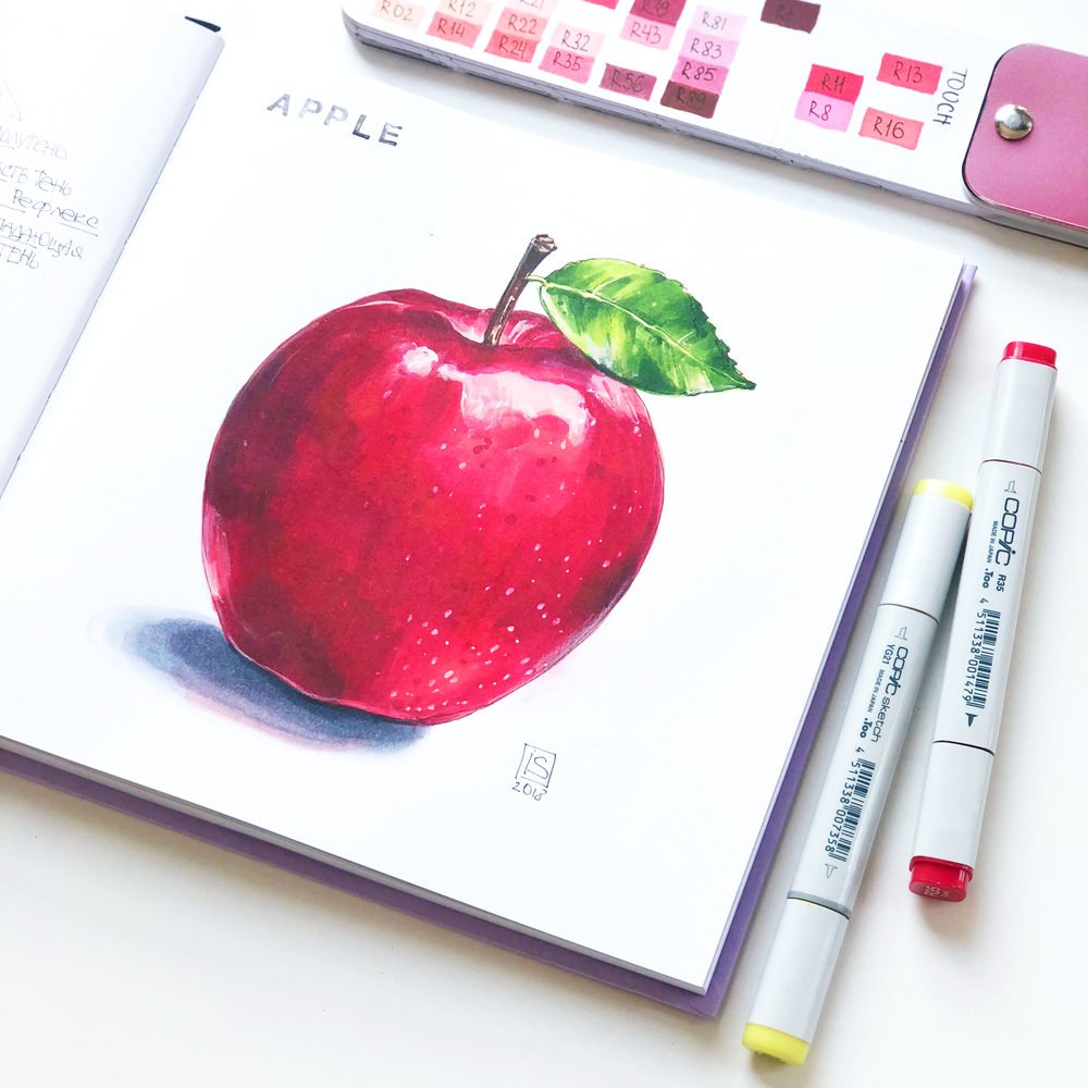 Яблоко маркерами для скетчинга