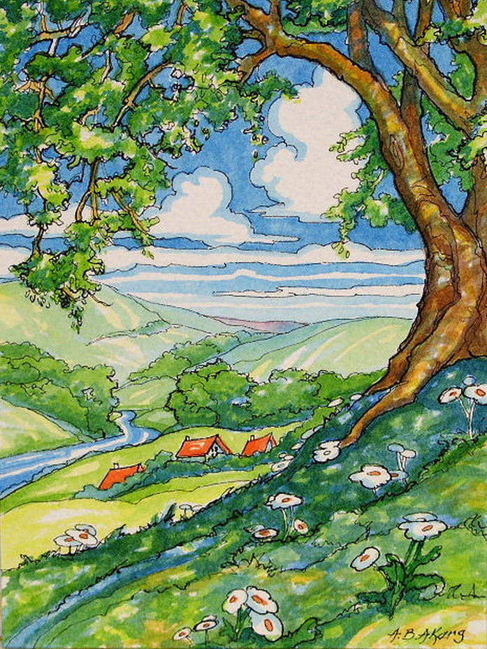 Пейзаж в цвете карандашом для детей