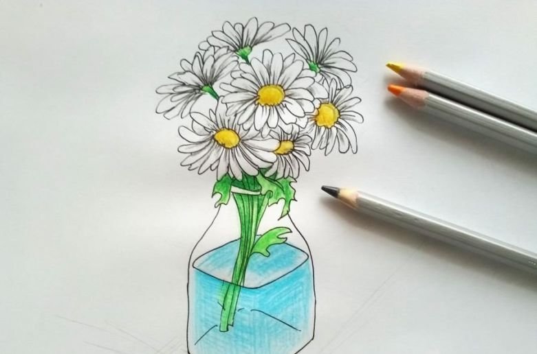 ![Ромашки в вазе карандашом]()
