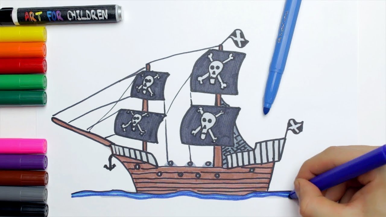 ![Пиратский корабль карандашом цветным]()