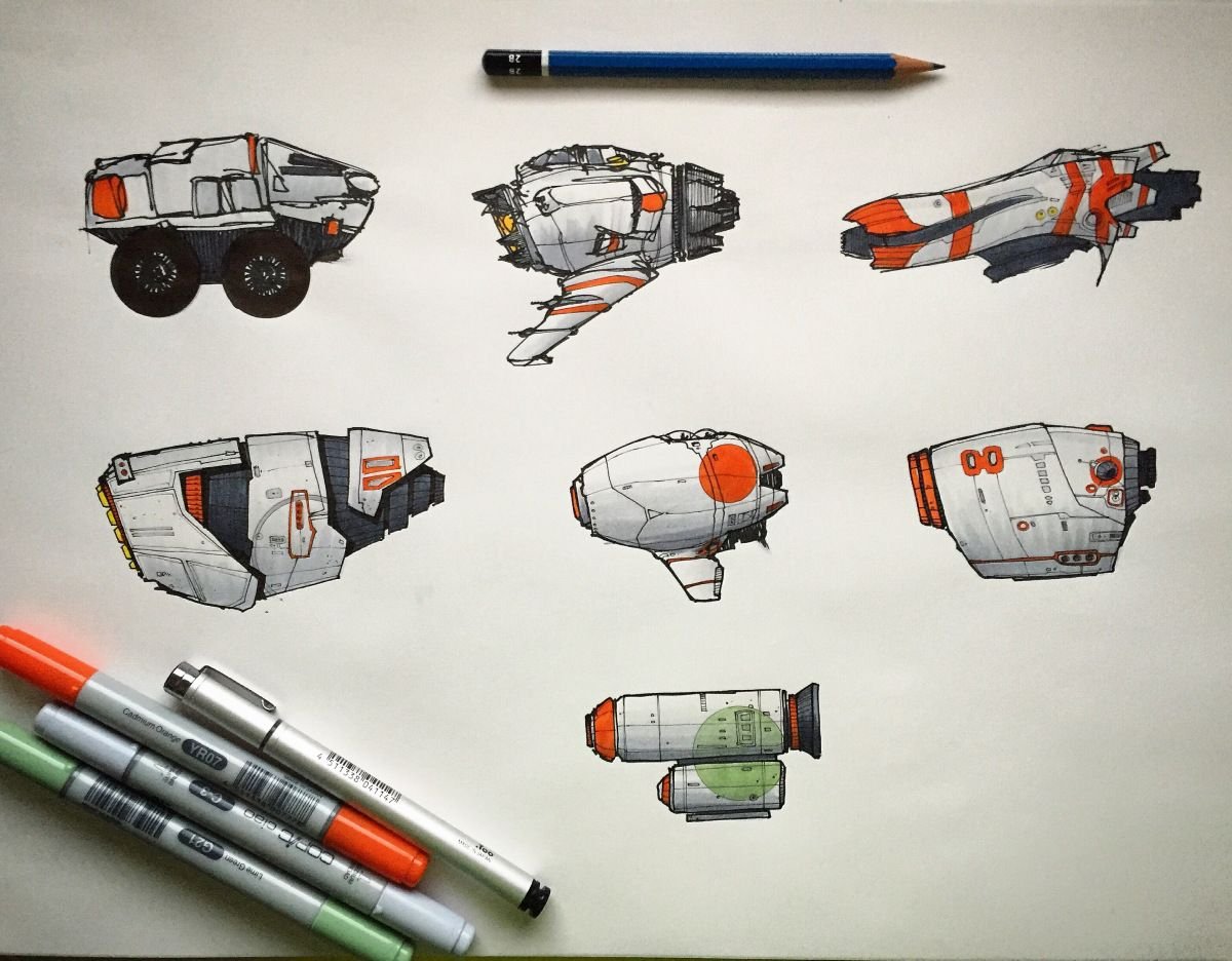 ![Скетчи космических кораблей маркерами]()