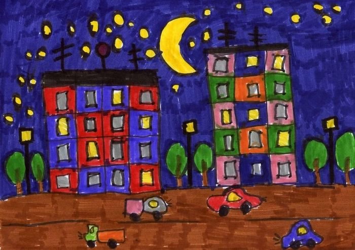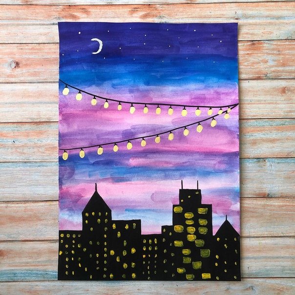 ![Ночной город рисунок красками]()