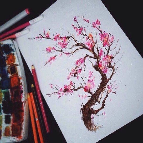 ![Сакура дерево рисунок фломастерами]()