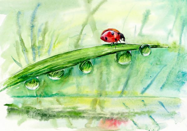 ![Божьи коровки на травинке акварель]()