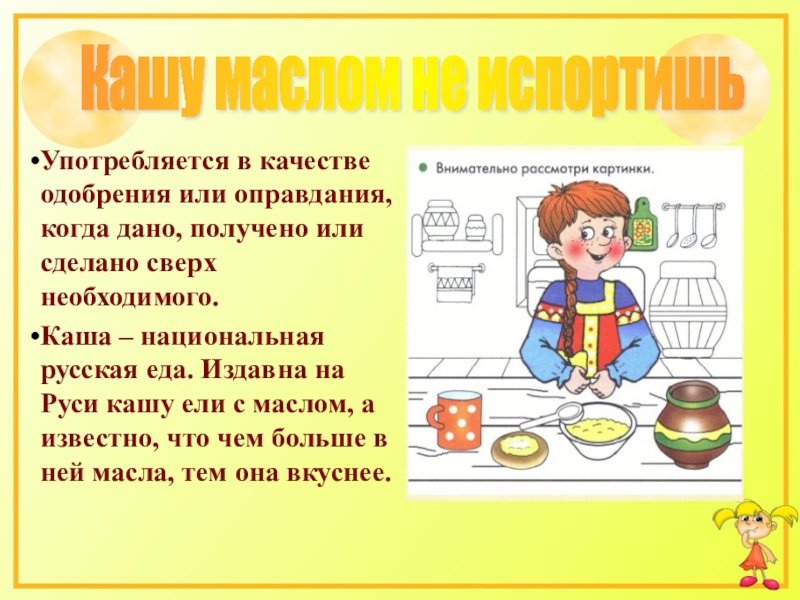 ![Фразеологизм кашу маслом не испортишь]()