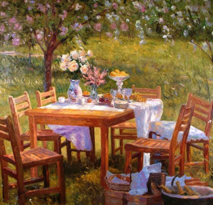 ![Столик в саду живопись]()