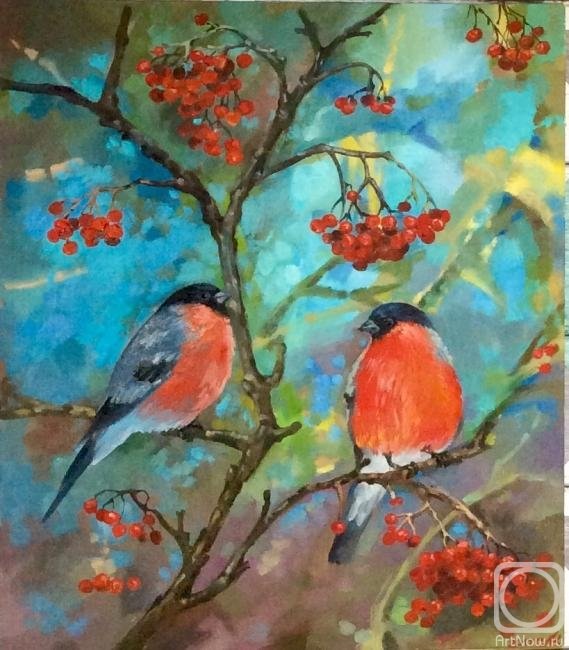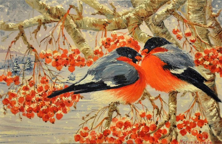 ![Снегири на рябине живопись]()