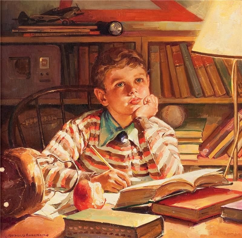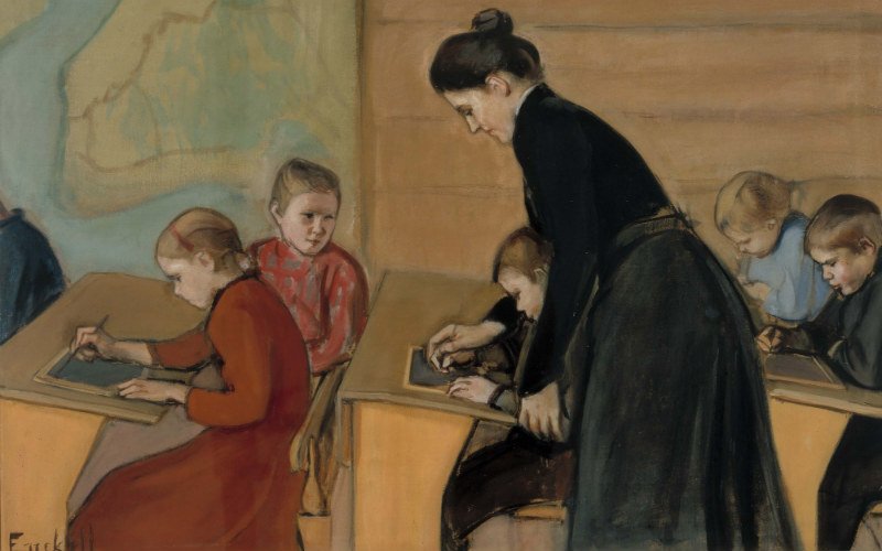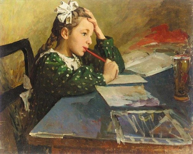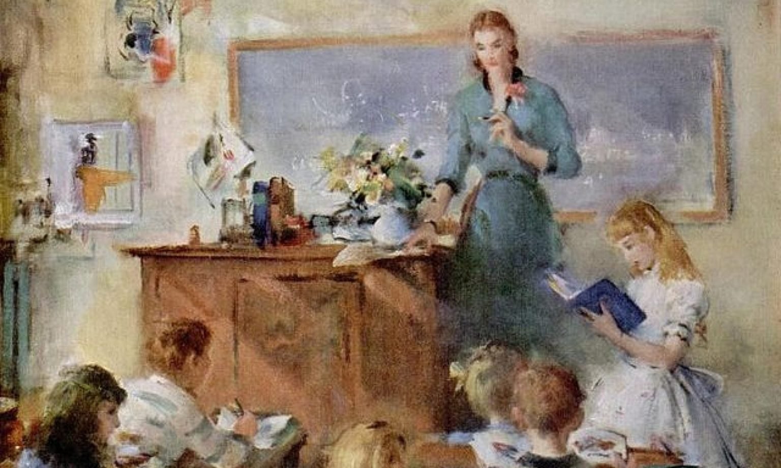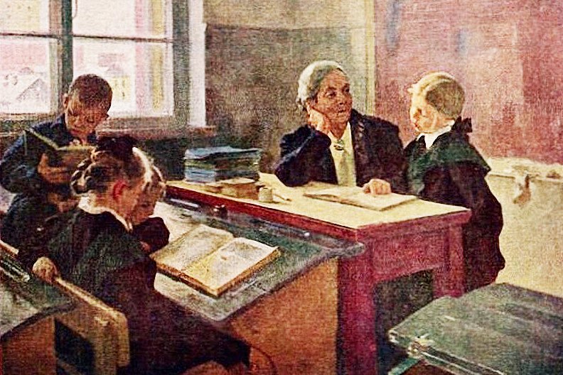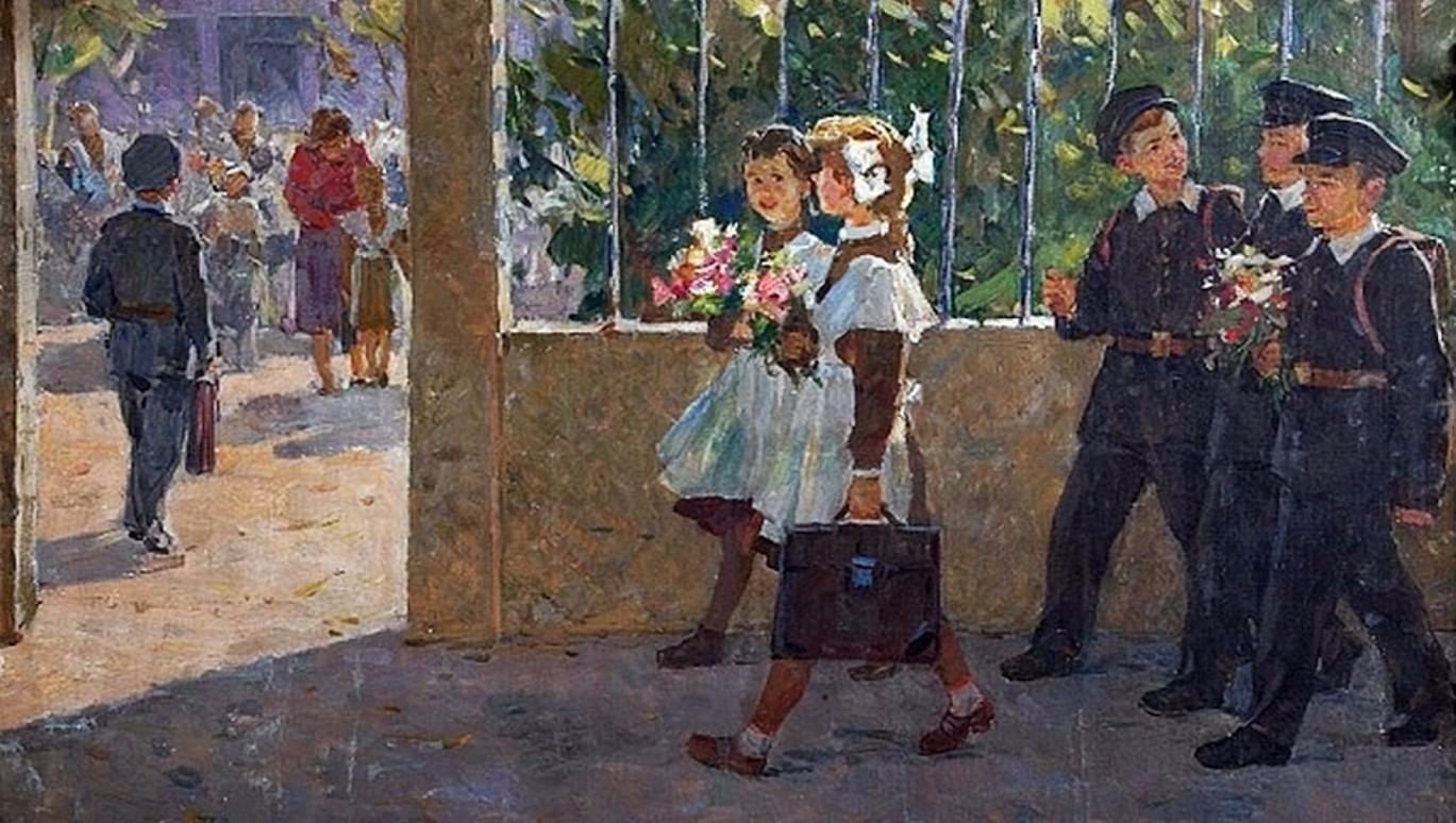 ![Строганов Аркадий Петрович «первый урок» 1957.]()