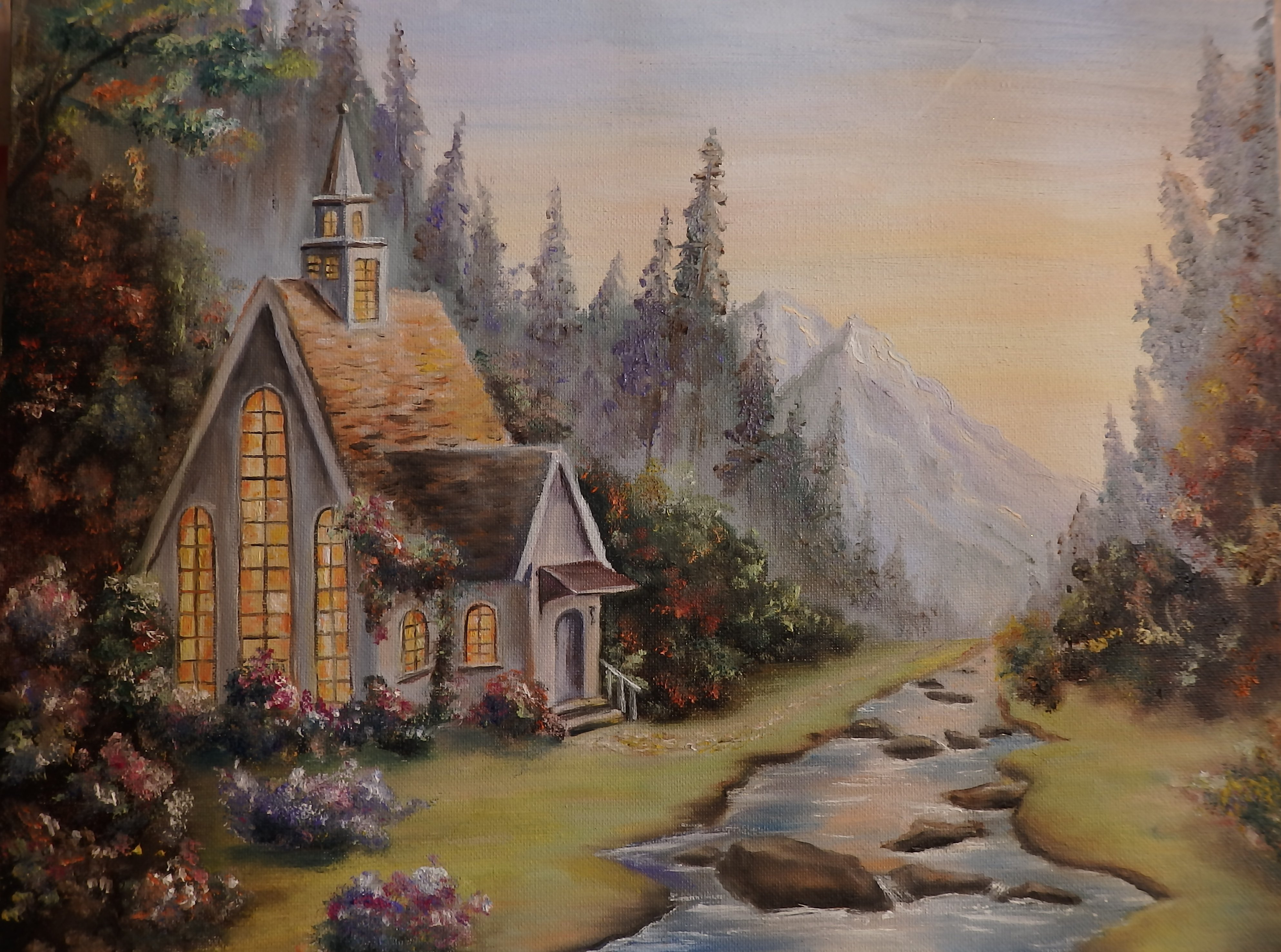 ![Пейзаж с домиком маслом]()