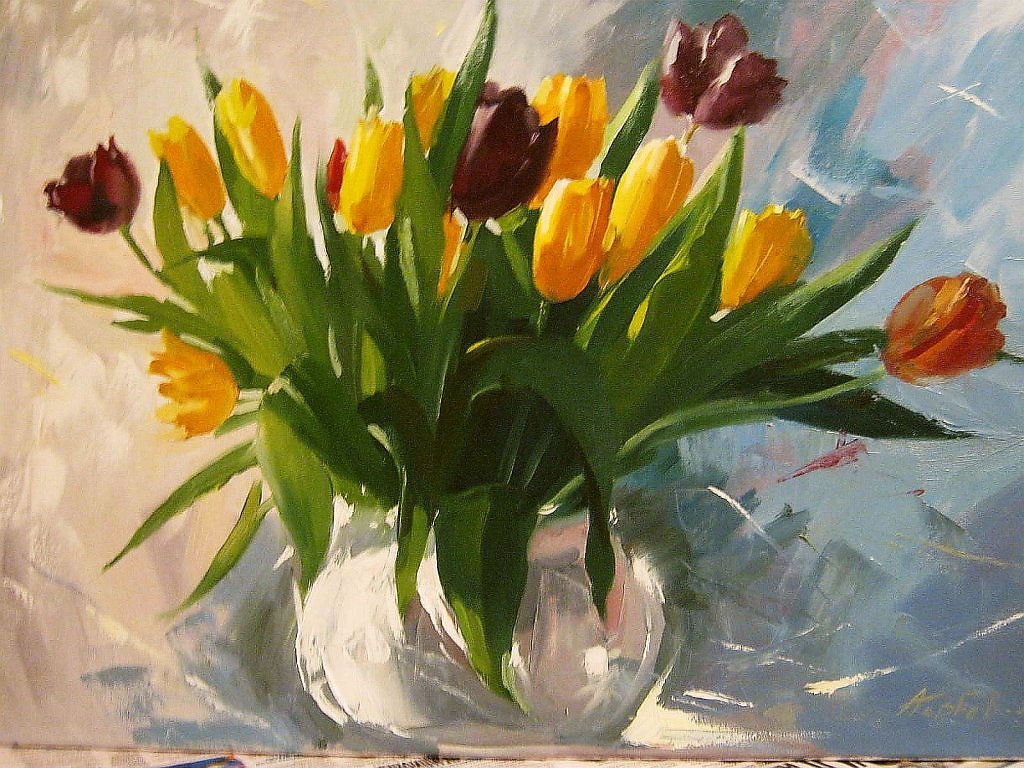 ![Тюльпаны маслом мастихином]()