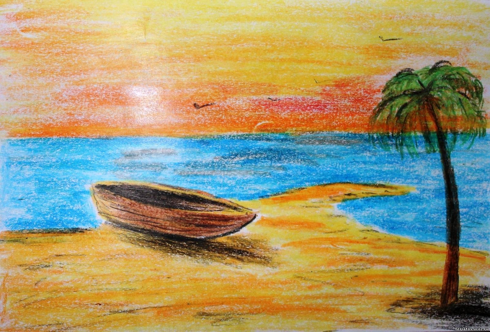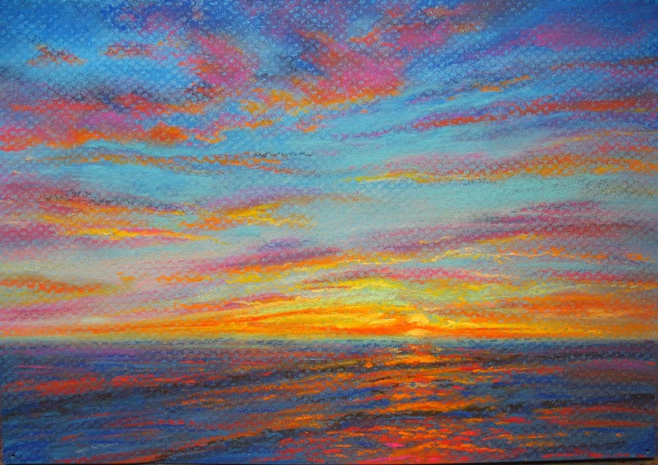 Закат на море пастелью масляной