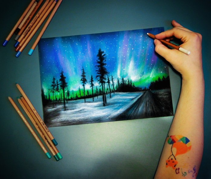 Северное сияние масляной пастелью