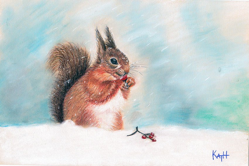 Белка зимой акварель