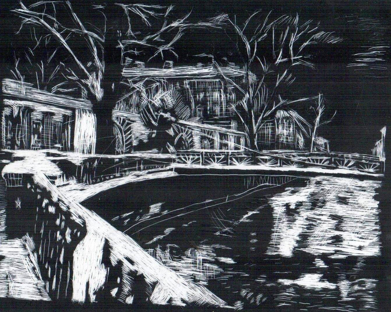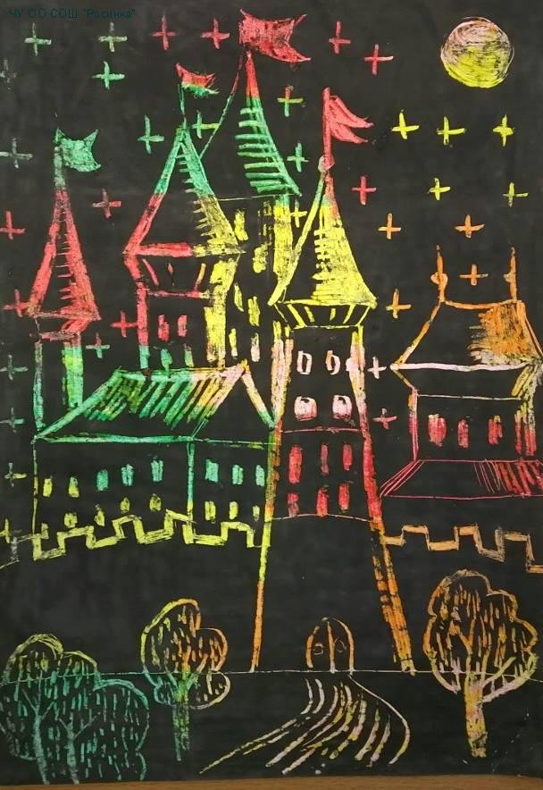 Ночной город в технике граттаж