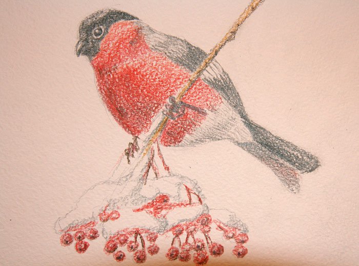 Снегирь цветными карандашами