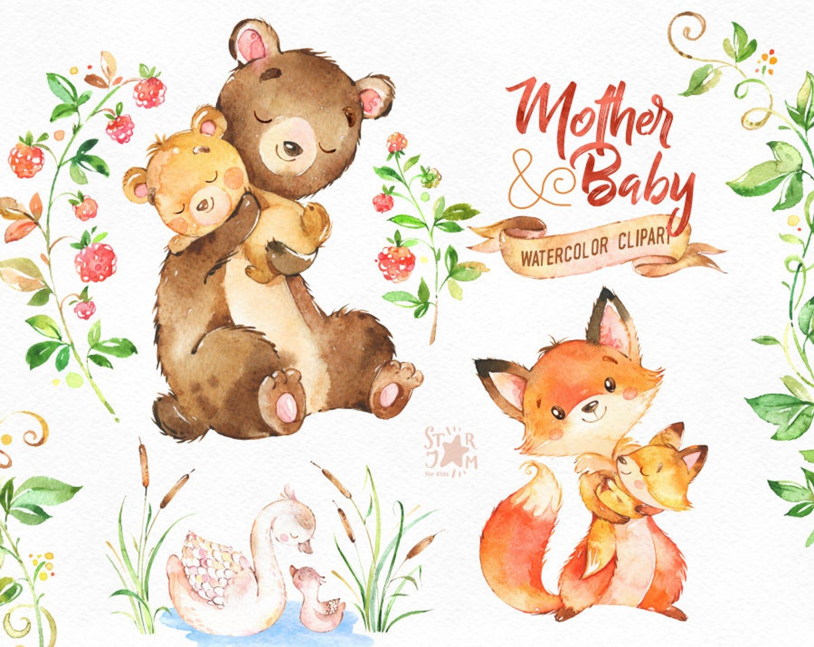 Акварельные животные мама и малыш