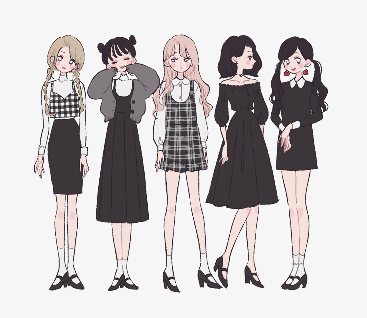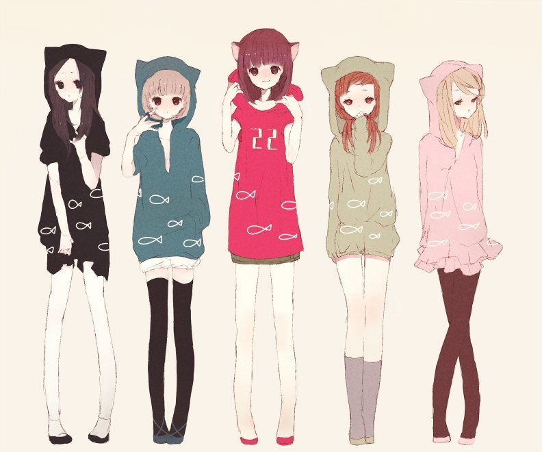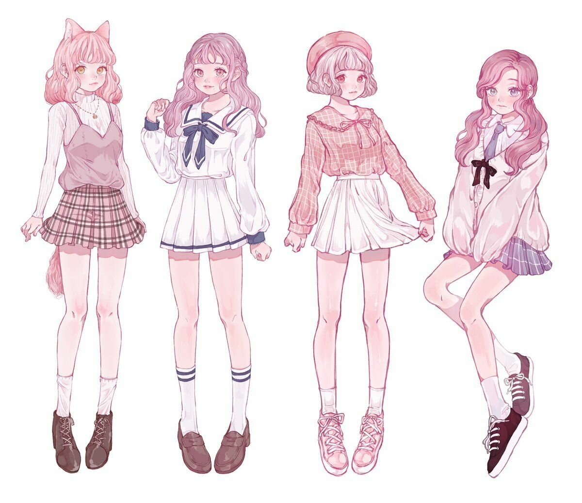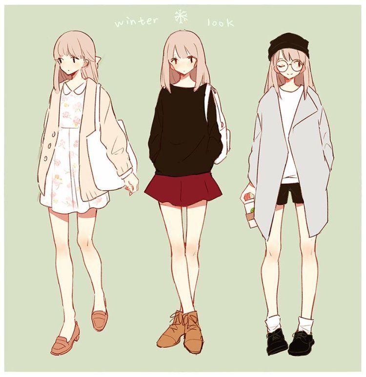 ![Аниме девушки в повседневной одежде]()