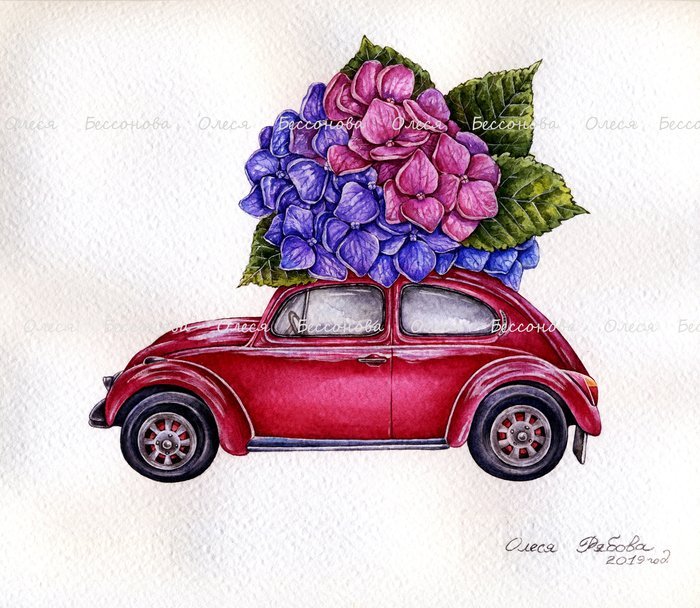 ![Машина с цветами акварель]()