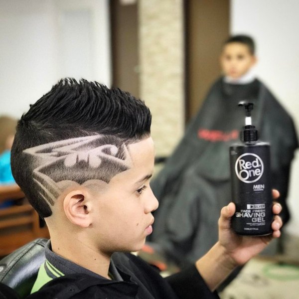 ![Стильные стрижки для мальчиков с узором]()