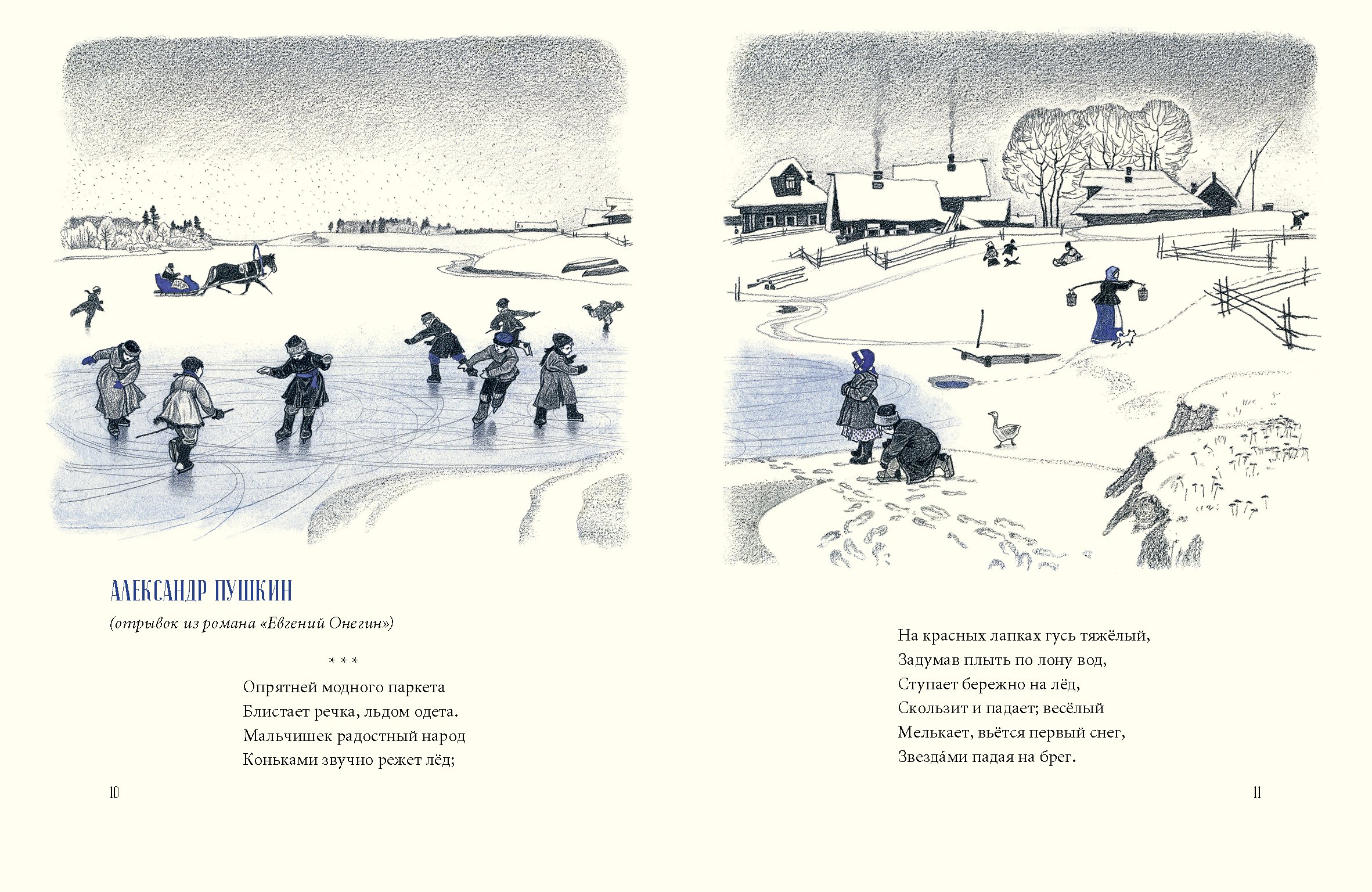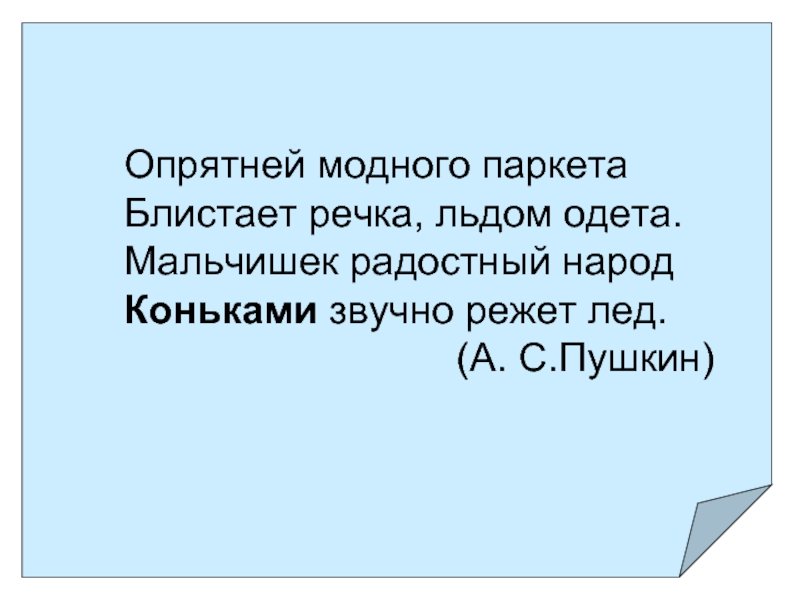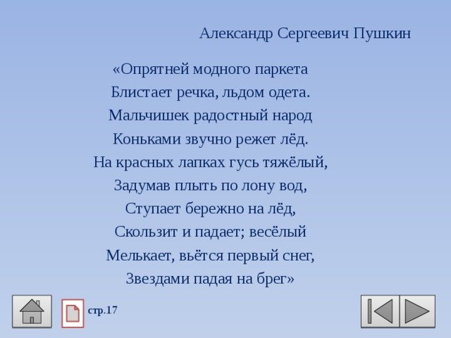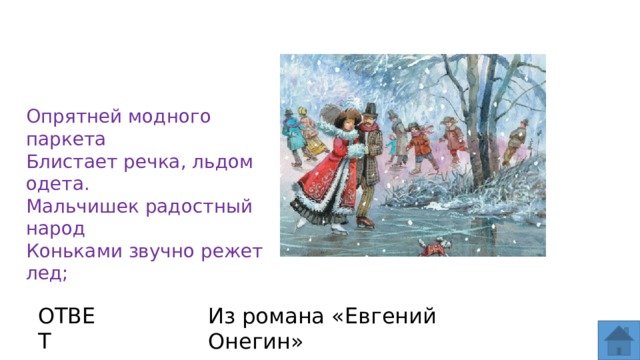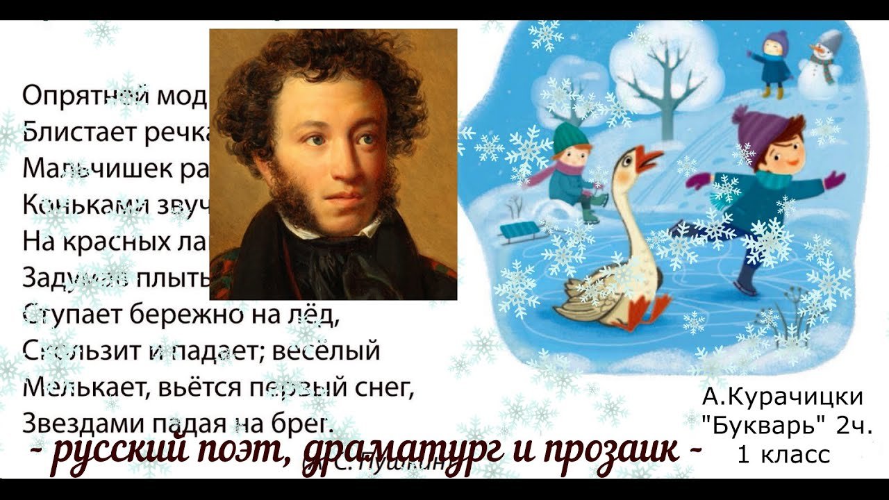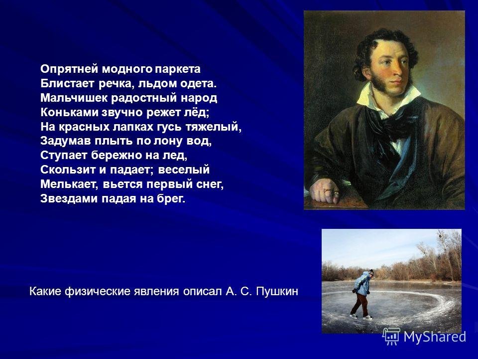 ![Стих Пушкина опрятней модного паркета блистает речка льдом одета]()