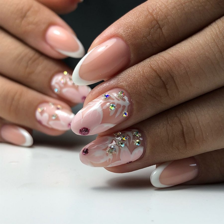 ![Белый френч на миндалевидных ногтях с дизайном 2021]()