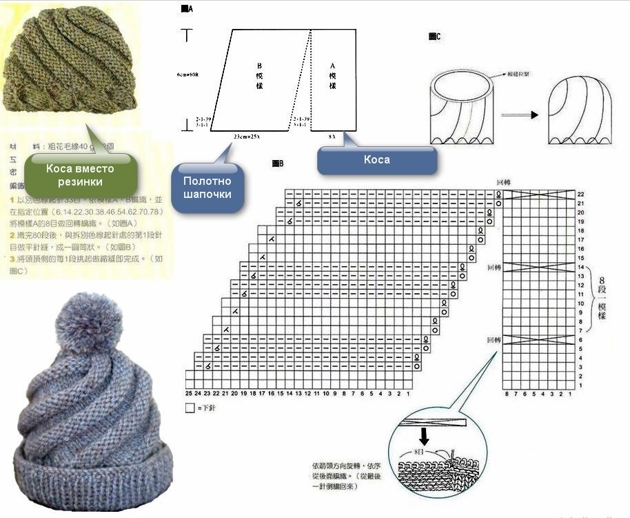 ![Модные шапки схемы вязания спицами]()