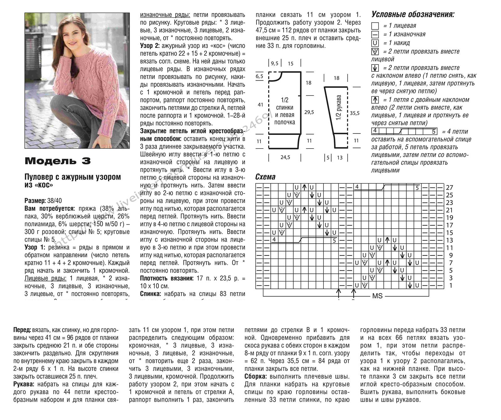 ![Вязание спицами ажурных узоров для полувера]()