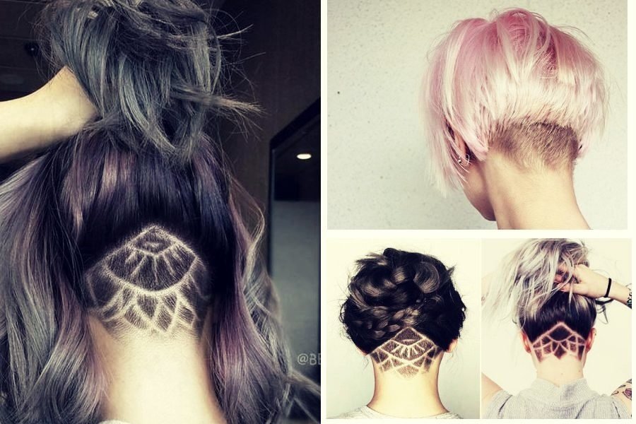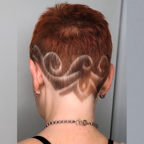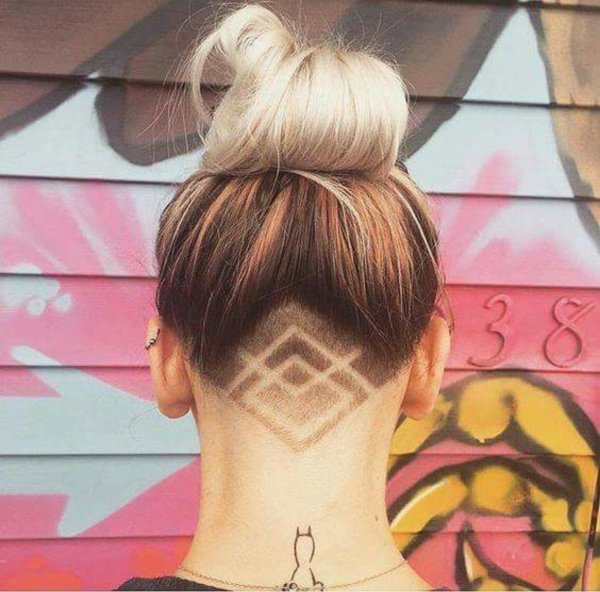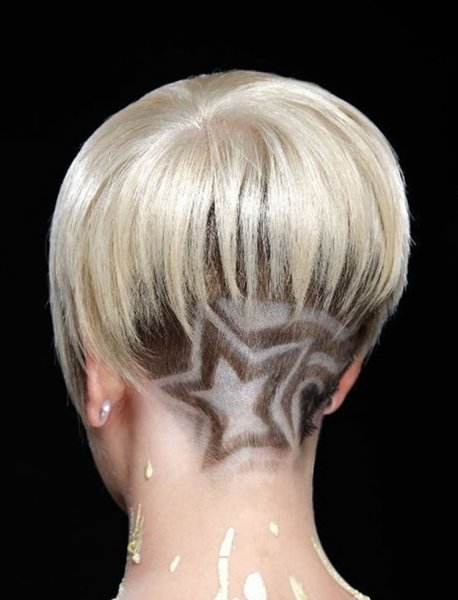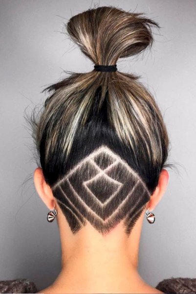 ![Выбритый затылок у девушек с короткими волосами с узором]()