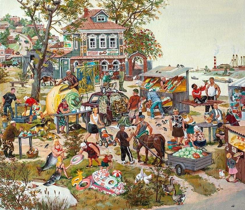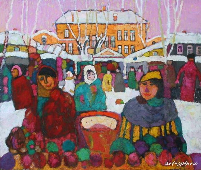 Рисунок "Базарный день" представляет собой яркую и живую картину, запечатлевшую атмосферу традиционного базара. На нем можно увидеть множество разнообразных людей, которые оживленно общаются, торгуются и наслаждаются атмосферой этого места. Яркие цвета и детали создают ощущение движения и наполняют работу энергией. Рисунок позволяет зрителю окунуться в мир суеты и радости базарной жизни, перенести его в прошлое или просто насладиться яркими красками и множеством деталей, которые заполняют эту работу.