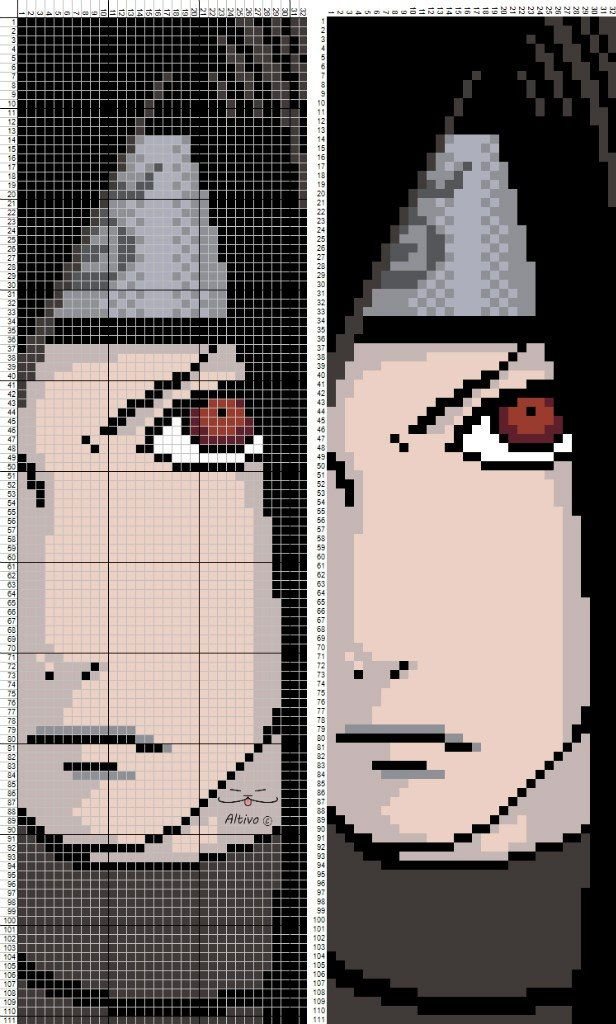 Итачи рисунок по клеточкам - это увлекательное занятие, которое позволяет создавать красочные и детализированные изображения с помощью простого инструмента: клеточной бумаги. Отличительной особенностью этого метода является то, что для создания рисунка используются только квадратные или прямоугольные фишки, каждая из которых соответствует одной клетке на бумаге. Это позволяет точно передать пропорции и детали изображения, делая его максимально реалистичным. Благодаря своей простоте и доступности, рисование по клеточкам становится популярным хобби как для детей, так и для взрослых. Оно развивает творческое мышление, воображение и мелкую моторику рук, а также помогает расслабиться и отвлечься от повседневных забот. Итачи - это персонаж из популярной японской манги и аниме "Наруто", поэтому рисование его портрета по клеточкам может быть интересным вызовом для поклонников этой серии. В результате получится уникальное и оригинальное произведение искусства, которое можно использовать как украшение для дома или подарок для друзей.