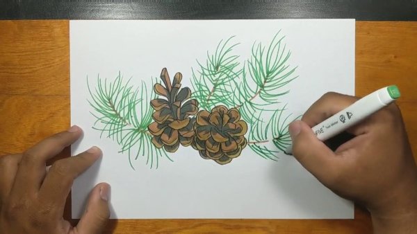 Поэтапное рисование ветка с шишкой