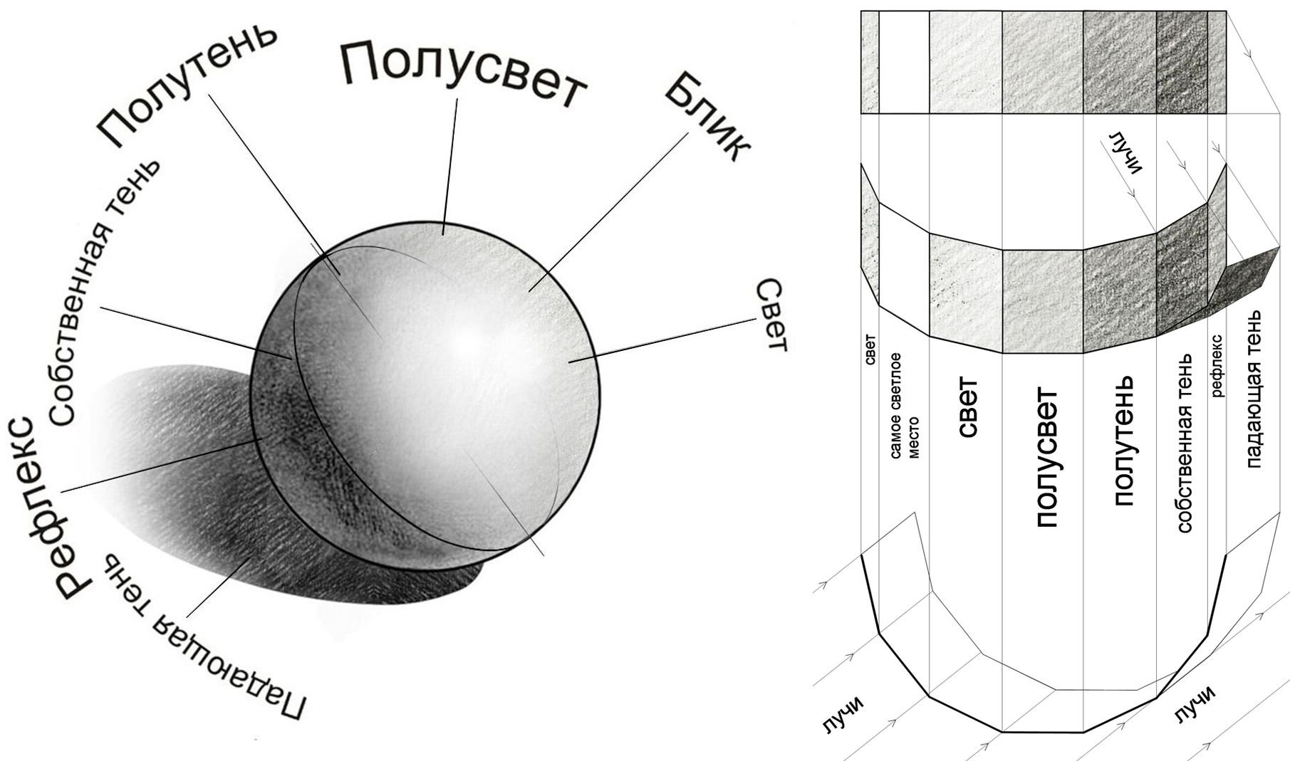 Свет тень полутень рефлекс блик в рисунке карандашом