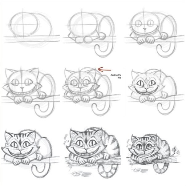 ![Как нарисовать Чеширского кота из Алисы в стране чудес карандашом]()